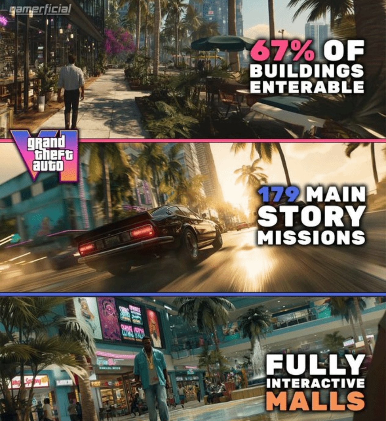 据泄露信息显示,《GTA6》旨在打造极致的沉浸感。游戏世界中约67%的建筑物可进入,并拥有多个完全互动式的购物中心。环境交互显著增强,车辆涉水时会缓慢进水,水下枪战子弹速度会因阻力减缓。生活细节也大幅提升,角色有逐口进食动画,NPC会对玩家行为产生反应,车辆则首次实现“全互动式内饰”。叙事上,游戏可能包含分支选择、谈判场景以及超过100个快速事件和小游戏。